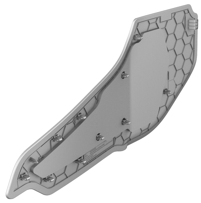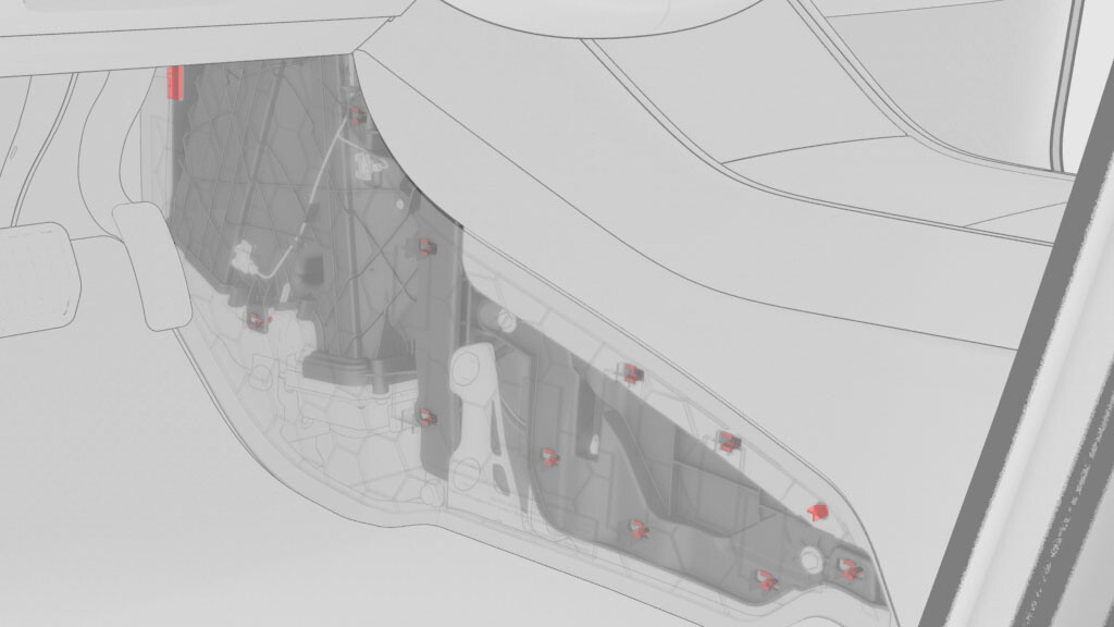 - Align the tab in the front of the LH side panel carpet before attaching the clips.