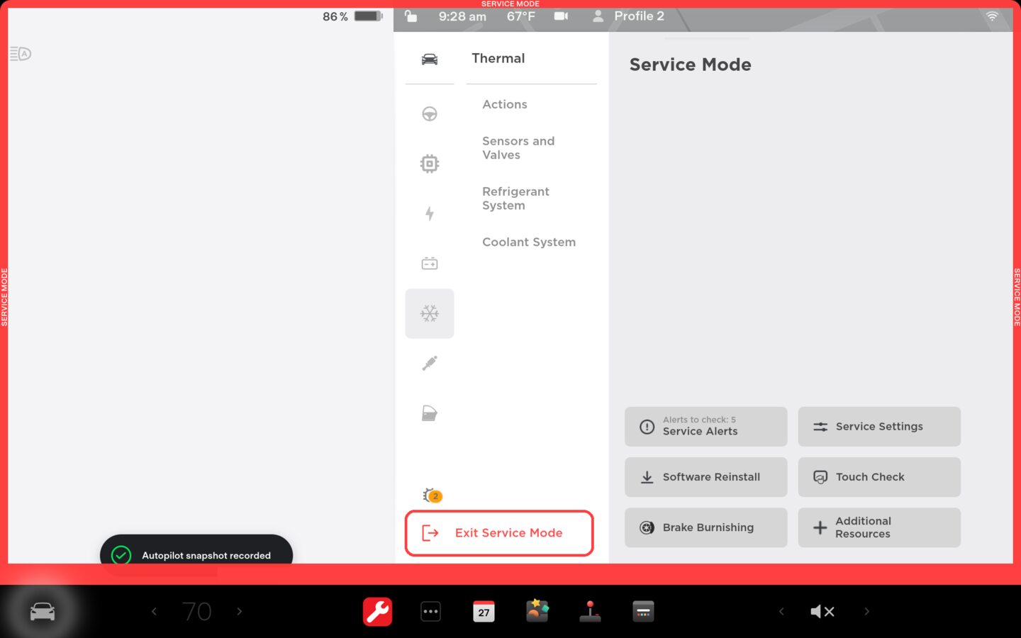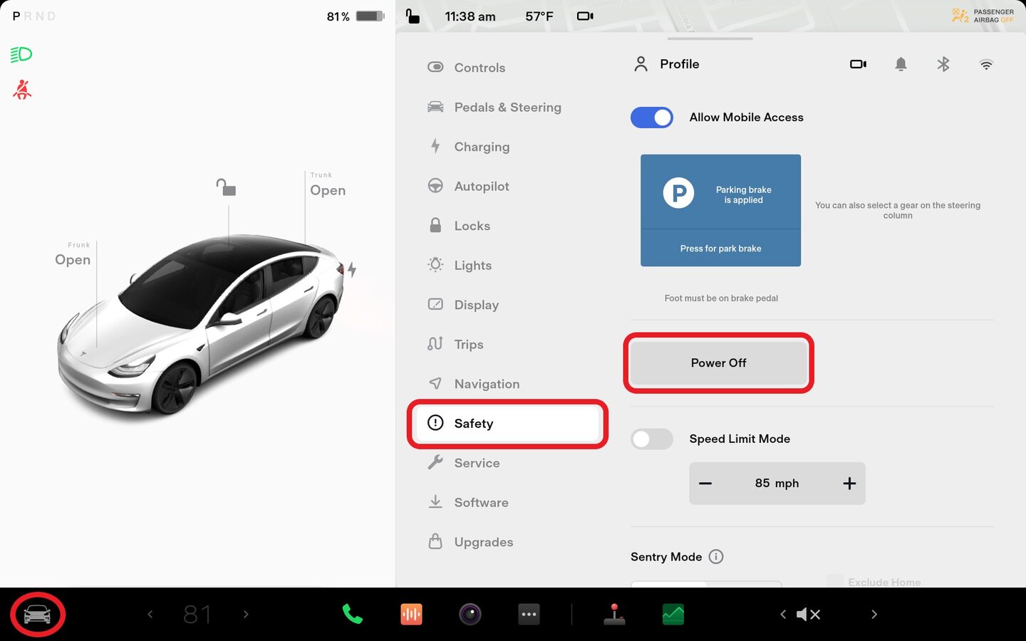 NoteVia UI > Controls > Software, Touch and hold "Model 3 or Y" for 4 seconds then release, Use screen keyboard to type "service" into dialog box then select OK