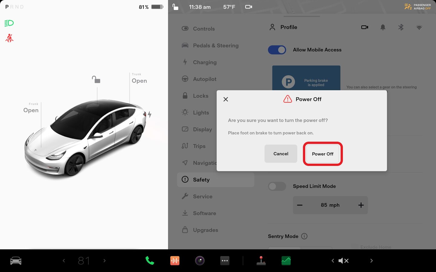 NoteVia Controls > Safety > Power Off, Select Power Off button at warning dialogue box