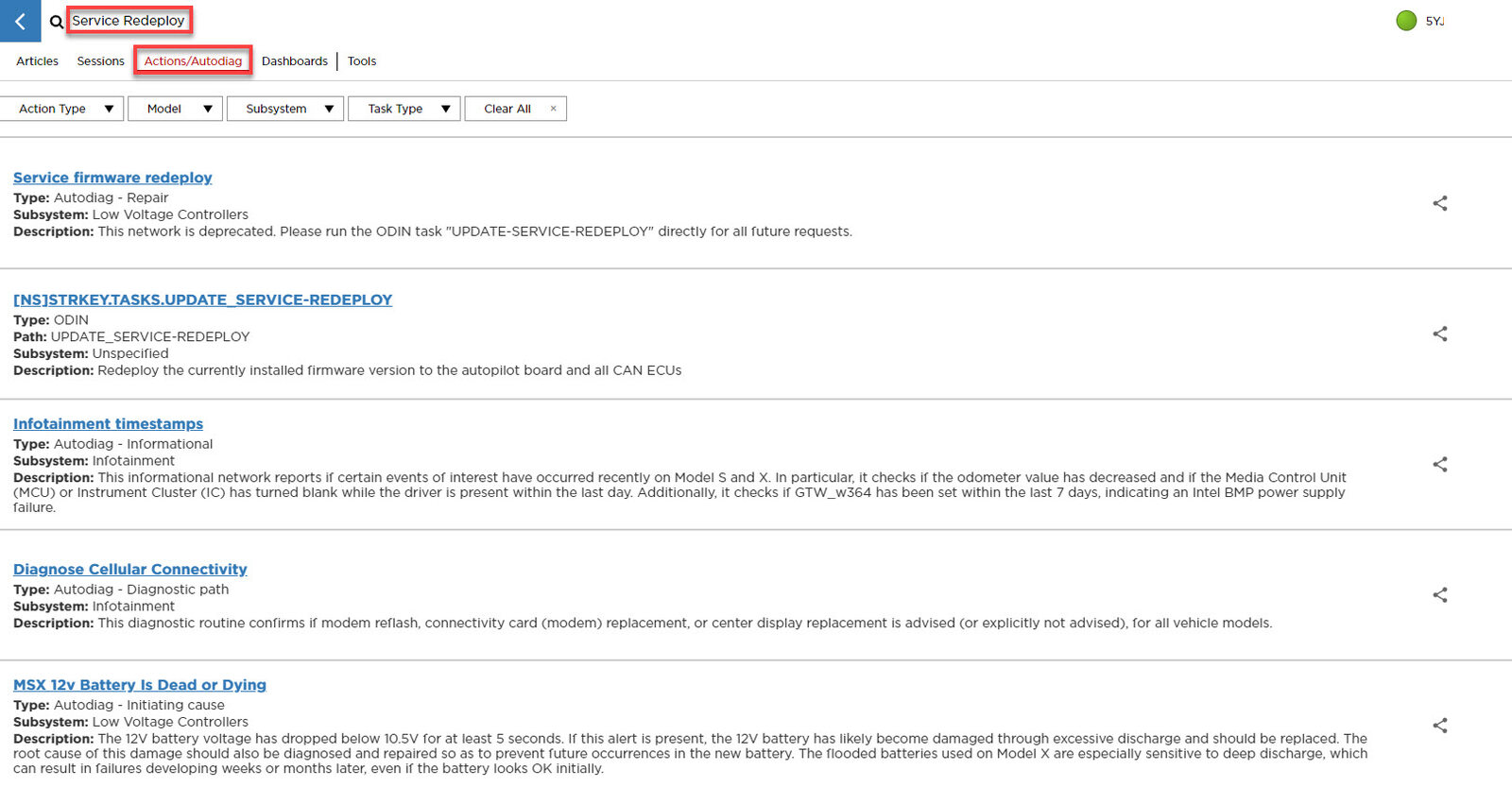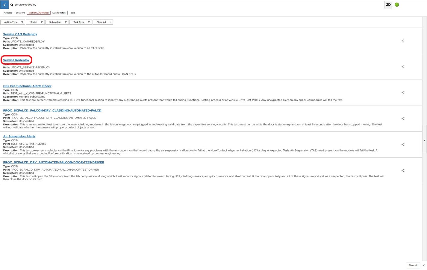 Select ‘Actions/Autodiag’ and search for ‘Service_Redeploy’