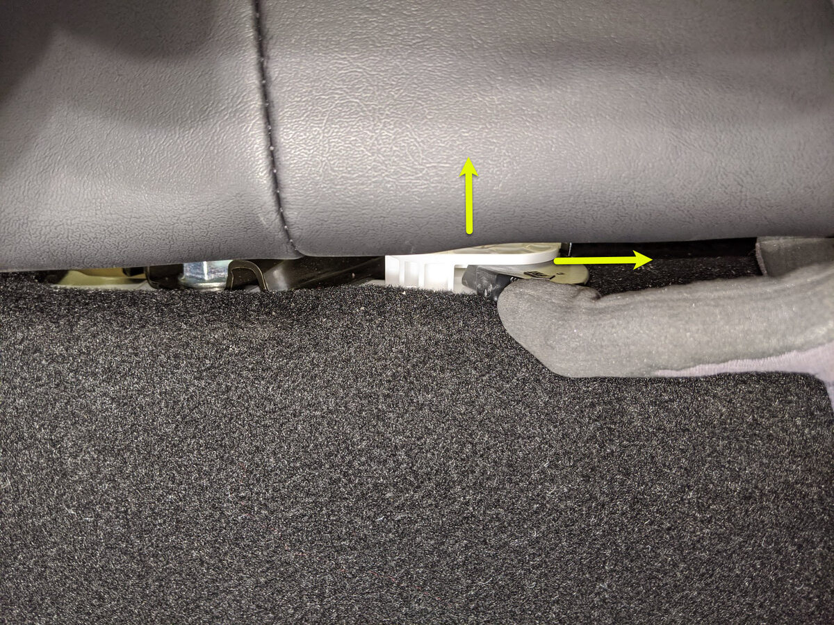 Note2x tabs, 2x connectors, Slide locking tabs to left of vehicle while lifting up seat benchNewer models have connectors on both sides of bench, Older models have 2x connectors on one side of bench