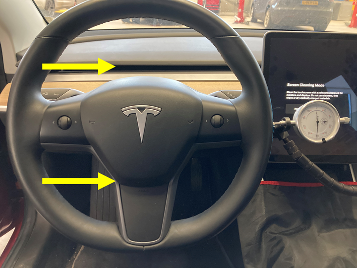 NoteInstall the suction cup onto the center display. Apply masking tape onto the suction cup for protection, then install the brake run-out tool onto the suction cup. Align the tool horizontally with the tape on the steering wheel and at the 3 o'clock position.NoteMake sure that the indicator rod is properly depressed and allows travel in both directions without bottoming out. Set dial to zero.