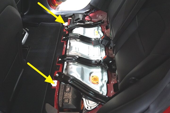 Note2x tabs, 2x connectors, Slide locking tabs to left of vehicle while lifting up seat bench. Newer models have connectors on both sides of bench, Older models have 2x connectors on one side of bench