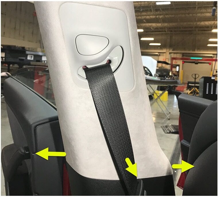 Note4x clips, Lower the seat belt slider to align it with the B-pillar panel, Insert top portion of upper B-pillar under the headliner to align the clips, Press the bottom to fully seat upper B-pillar to lower B-pillar, Make sure the seal correctly overlaps the trim