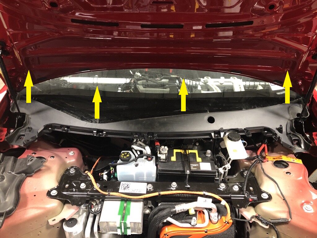 Note12x clips, Make sure frunk assembly is fully seated onto clips, Number of clips may vary on older vehicles, Ensure A/C compressor HVIL harness is not pinched between frunk assembly and thermal beam, replace any damaged clips