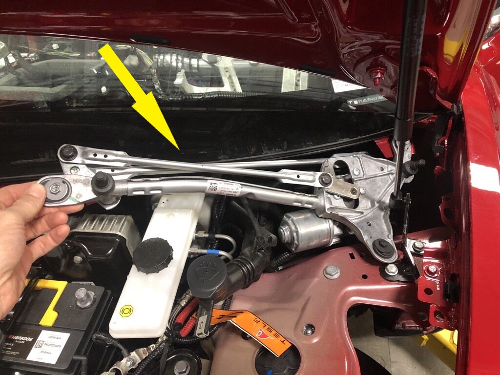 Connect washer hose from LH wiper arm to Y-tube fitting and secure washer hose clips