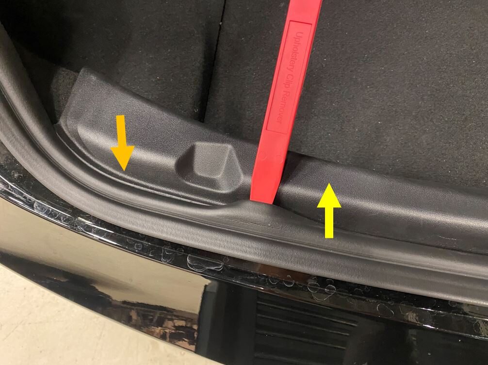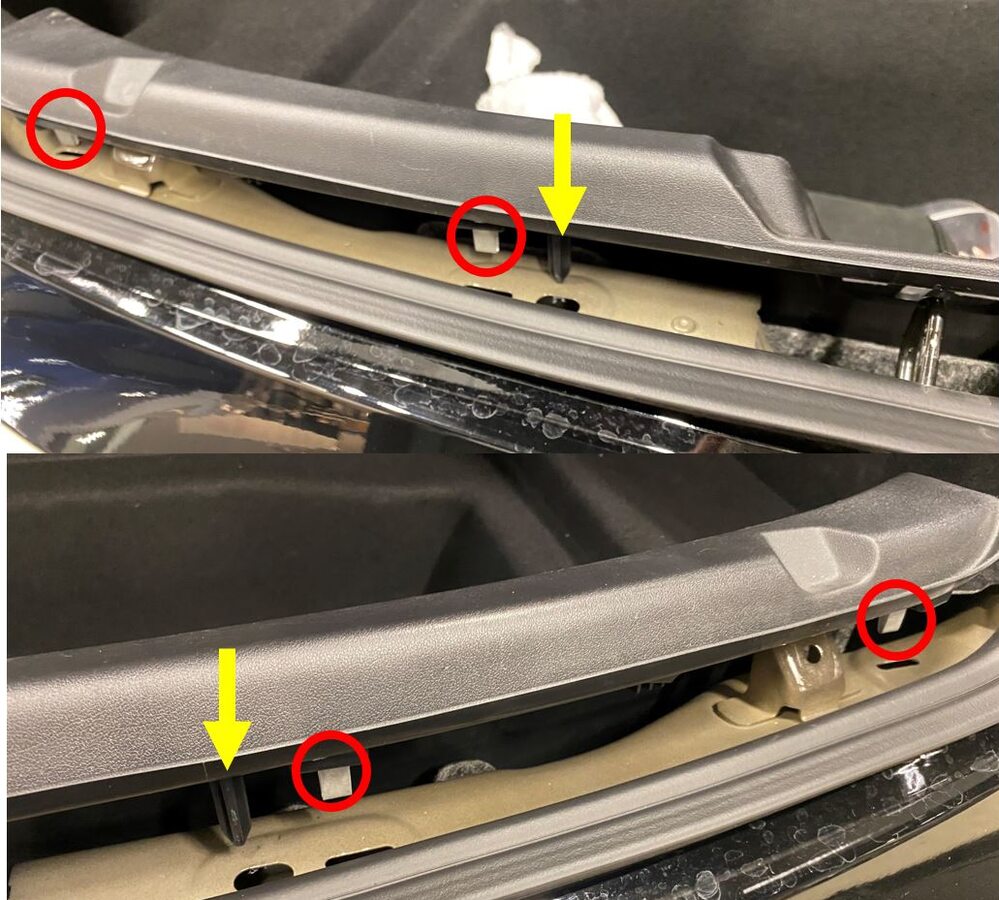 Nota4x clips, 1x location pin, Align the latch with center slot then 2 locator to their slot and then press to secure the clips, Adjust the seal to overlap the trim
