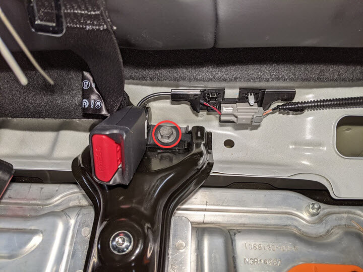 Install bolt securing LH seat belt catch and center seat belt to vehicle