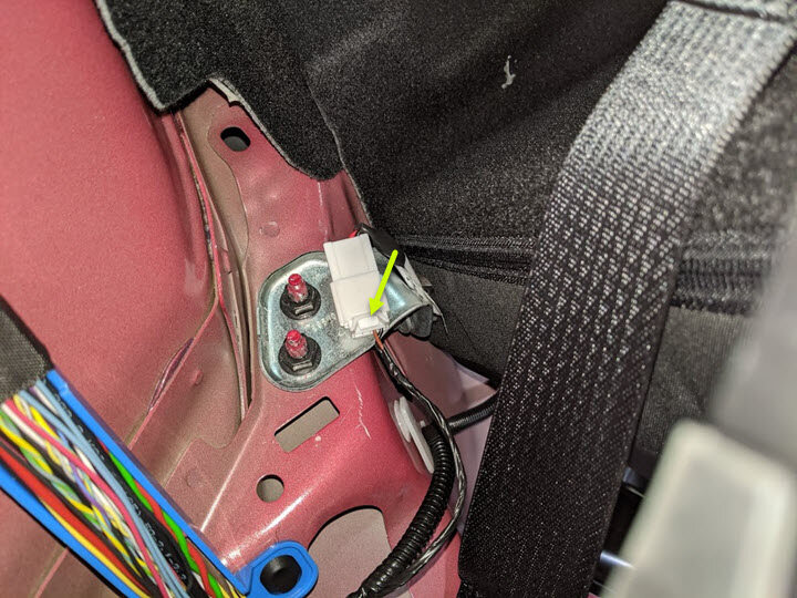 Nota2x tabs, 2x connectors, Slide locking tabs to left of vehicle while lifting up seat bench. Newer models have connectors on both sides of bench, Older models have 2x connectors on one side of bench