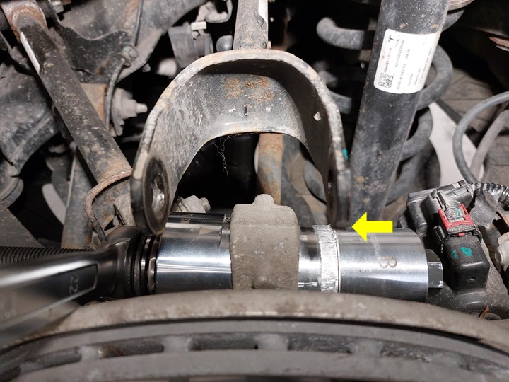 Mark the LH Rear Upper Knuckle Ball Joint with red paint pen.