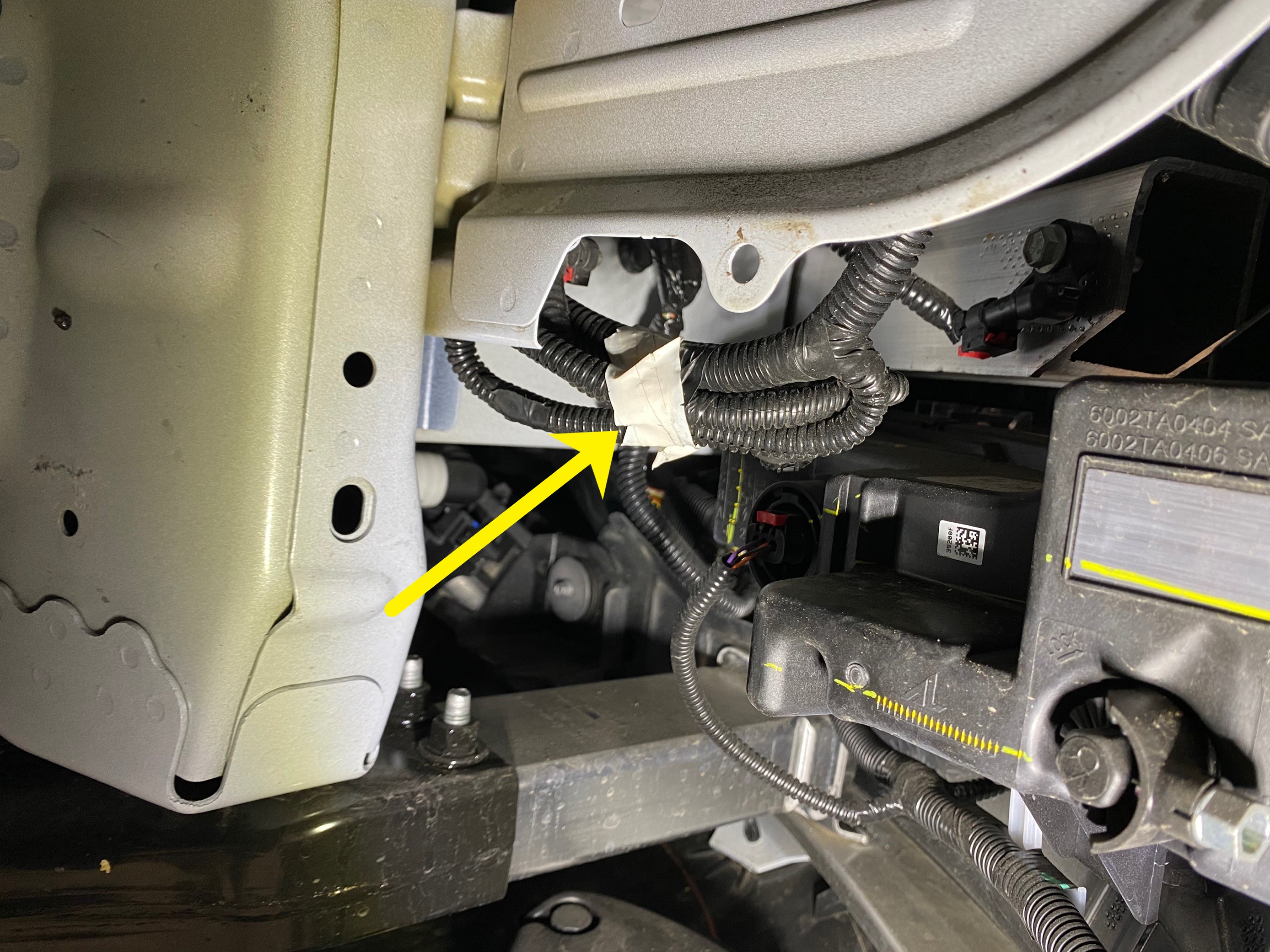 - 접이식 칼이나 유사한 공구를 사용하여 보행자 경고 스피커 전기 커넥터를 메인 전면 하네스 번들에 고정하는 테이프를 조심스럽게 제거합니다.