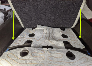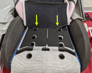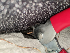 the rear hog rings (x3) that attach the driver seat cushion trim to the foam pad.