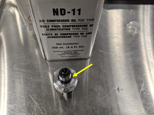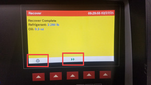 NoteConnect couplers to vehicle, Note the amount of refrigerant and oil recovered, mark oil drain bottle oil level (use a piece of tape marking the fluid level), Open couplers by turning clockwise, Using Main Menu > Recover > Verify hose connection, Machine will chime once process is complete, Vehicle may be left unattended, Note or print the amount of refrigerant and oil recovered, Refrigerant recovered should be ~2.24 lb (1.02 kg), Oil recovered should be ~0.3 oz (8.87 mL), If drained oil level increased more than 1.01 oz (30 mL) refer to drained oil loss chart https://toolbox.teslamotors.com/articles/353700