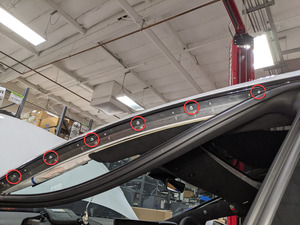 NoteIf there is foam in the front of the brightwork, refer to bulletin SB-13-12-005, A-Pillar Wind Noise.NoteApply masking tape to the front edge of the brightwork to prevent scratching the vehicle.