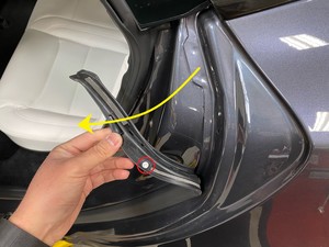 3. Position the LH secondary rear side body seal onto the body, fasten the clip, and then remove the adhesive backing and adhere the seal onto the body.