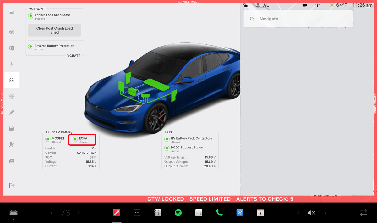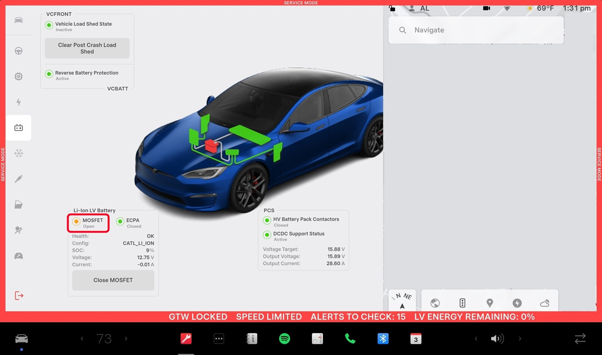 Figure 2. Li-ion LV Battery MOSFET status Open - If the previous step does not successfully recover the battery, proceed with using the Tesla LV Li-ion battery charger to recover the LV battery, and then repeat this procedure.