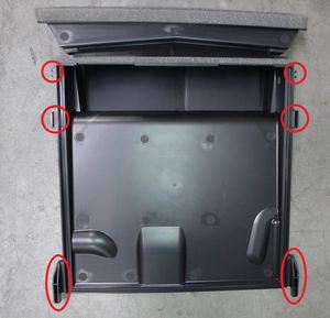 Note2x tabs, 2x datums, 2x slots, , Be cautious and do not damage the mounting clips, Maneuver cover forward and up in front of V-brace cross member.