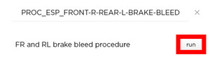 Open the RH front outer brake caliper bleeding valve then Click the play button next to PROC_ESP_FRONT-R-REAR-L-BRAKE-BLEEDvia Toolbox: (link)via Service Mode: Chassis ➜ Brakes ➜ Brake Bleed FR-RLvia Service Mode Plus: