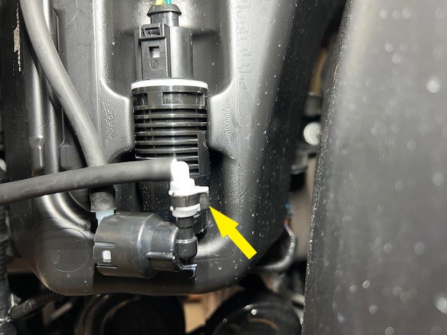 On newer vehicles, disconnect the front camera washer hose behind the LH wheel arch