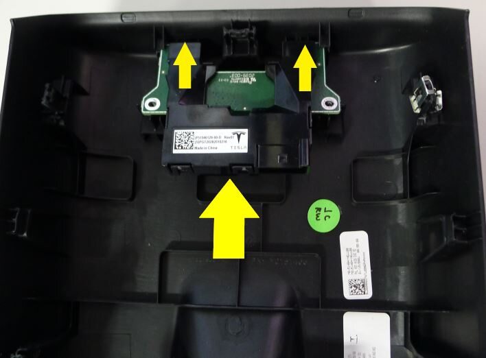Alinee las referencias (2 uds.) en las ranuras del soporte de la consola y conecte el conjunto USB y los mazos de cables eléctricos al conjunto del panel trasero de la consola central.