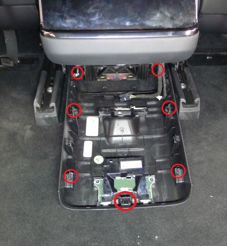 Suelte los clips (7 uds.) que sujetan el conjunto del panel trasero de la consola central a la consola central.