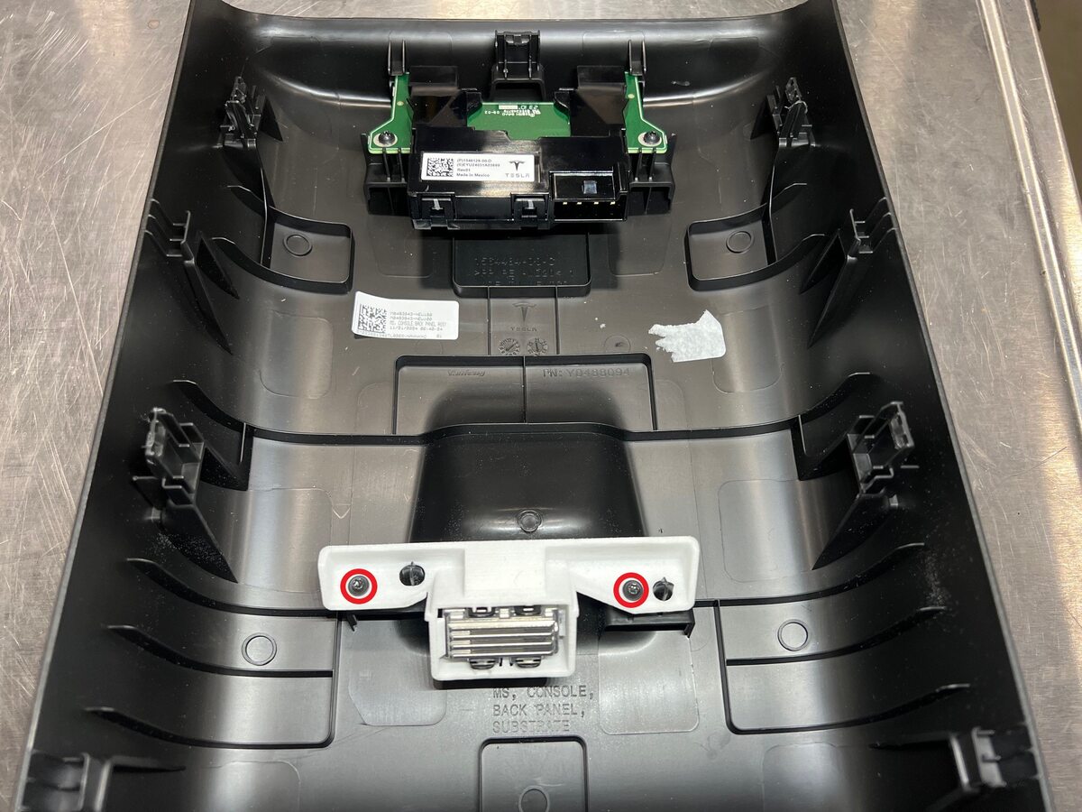 Retire los tornillos (2 uds.) que fijan el conjunto USB trasero al conjunto del panel trasero de la consola central.
