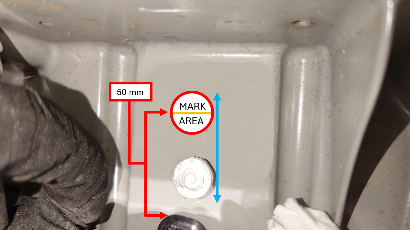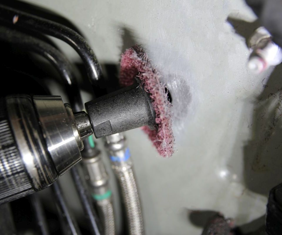 - Use a small-diameter (50 mm) medium-abrasive surface conditioning disc to remove the paint from the mating surface of the new rivet nut to ensure conductivity.