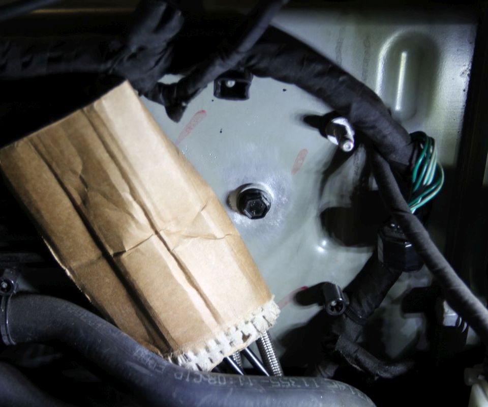 WarningWear protective eyewear and hearing protection when drilling.WarningOnly drill through the shock tower. Drilling too far can result in damage to the vehicle.CAUTIONDo not use excessive force on the drill. Use steady, medium pressure and drill speed to allow the drill bit to cut the material. If the pressure on the drill is excessive or the drill speed is too low, the cut hole is more likely to be torn and out-of-round.