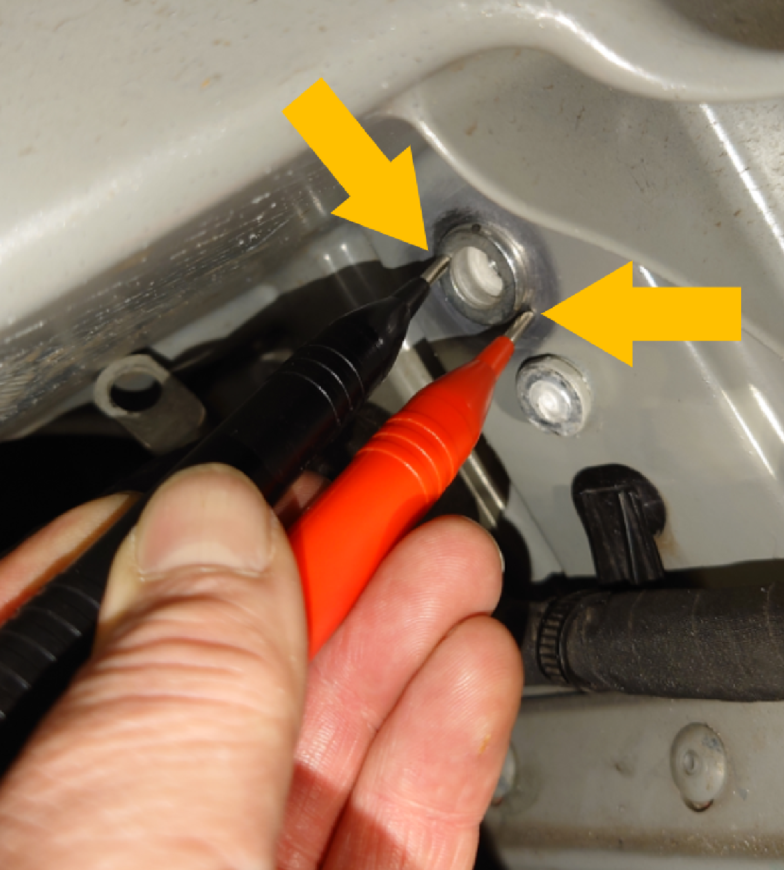 Use the Hioki resistance meter to measure the face of the rivet nut to the abraded aluminum surface of the LH front shock tower for resistance in milliohms.