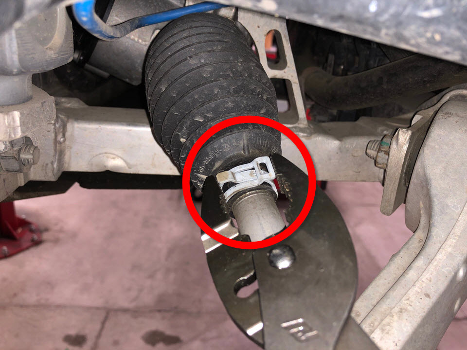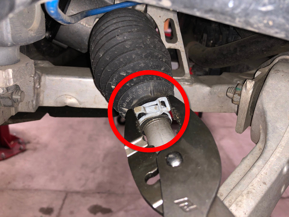 Attach the LH inner tie rod band clip by clamping the clip ear using the knipex ear clamp pliers.
