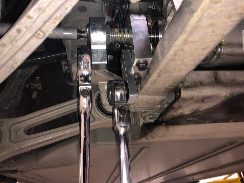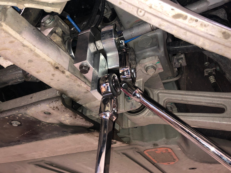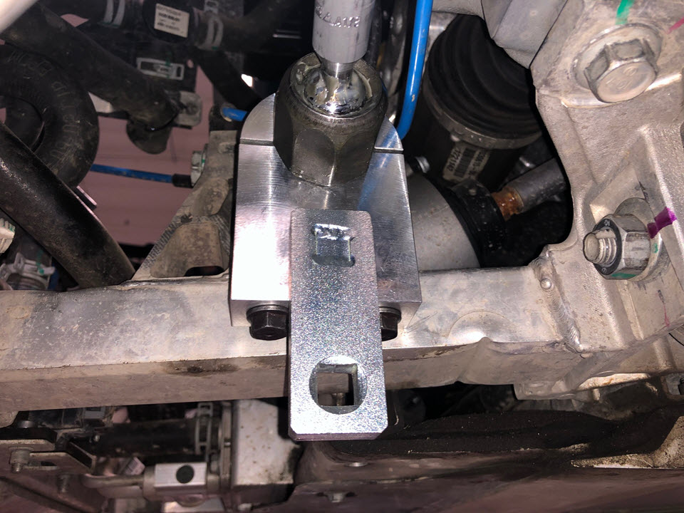 Install the steering gear clamp tool, crawfoot socket, and the anti-rotation device tool on the LH inner tie rod.
