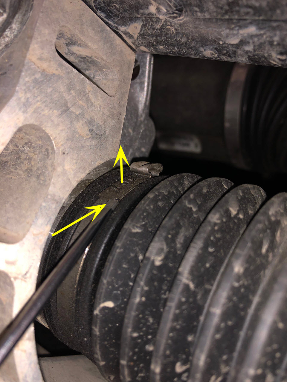Remove the clamp that attaches the inner side of the bellows to the LH inner tie rod using a small flat head screwdriver.