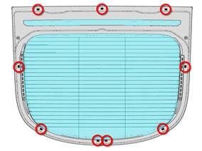 - Install the rear liftgate glass, making sure that the gaps between the glass and the liftgate are even front to back and side to side. Evenly and progressively press the glass onto the spacers.