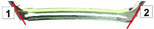 1 Do not cut to left of this red line. 2 Do not cut to right of this red line. CAUTIONWhile cutting, take care not to cut further than necessary to avoid damaging the liftgate or the rear roof panel.CAUTIONBefore and during cutting, use water or alcohol to lubricate the urethane. If any other materials are used for lubrication, fully clean the affected area before applying more urethane. -