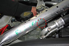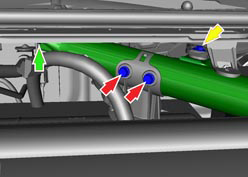 - Remove the bolt that attaches the LH shock tower brace to the bulkhead (green arrow) (torque 30 Nm).