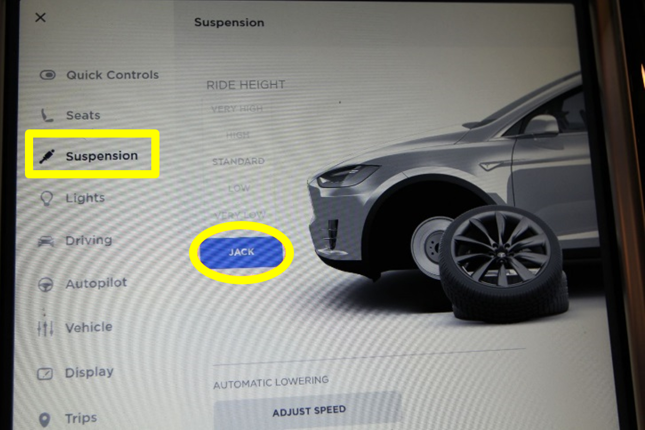 - If the vehicle has an air suspension, on the vehicle touchscreen, touch Controls (vehicle icon), touch Suspension, press and hold the brake pedal and touch Standard to deactivate Jack Mode.