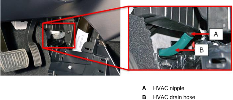 From the LH footwell, disconnect the HVAC drain hose from the HVAC nipple.