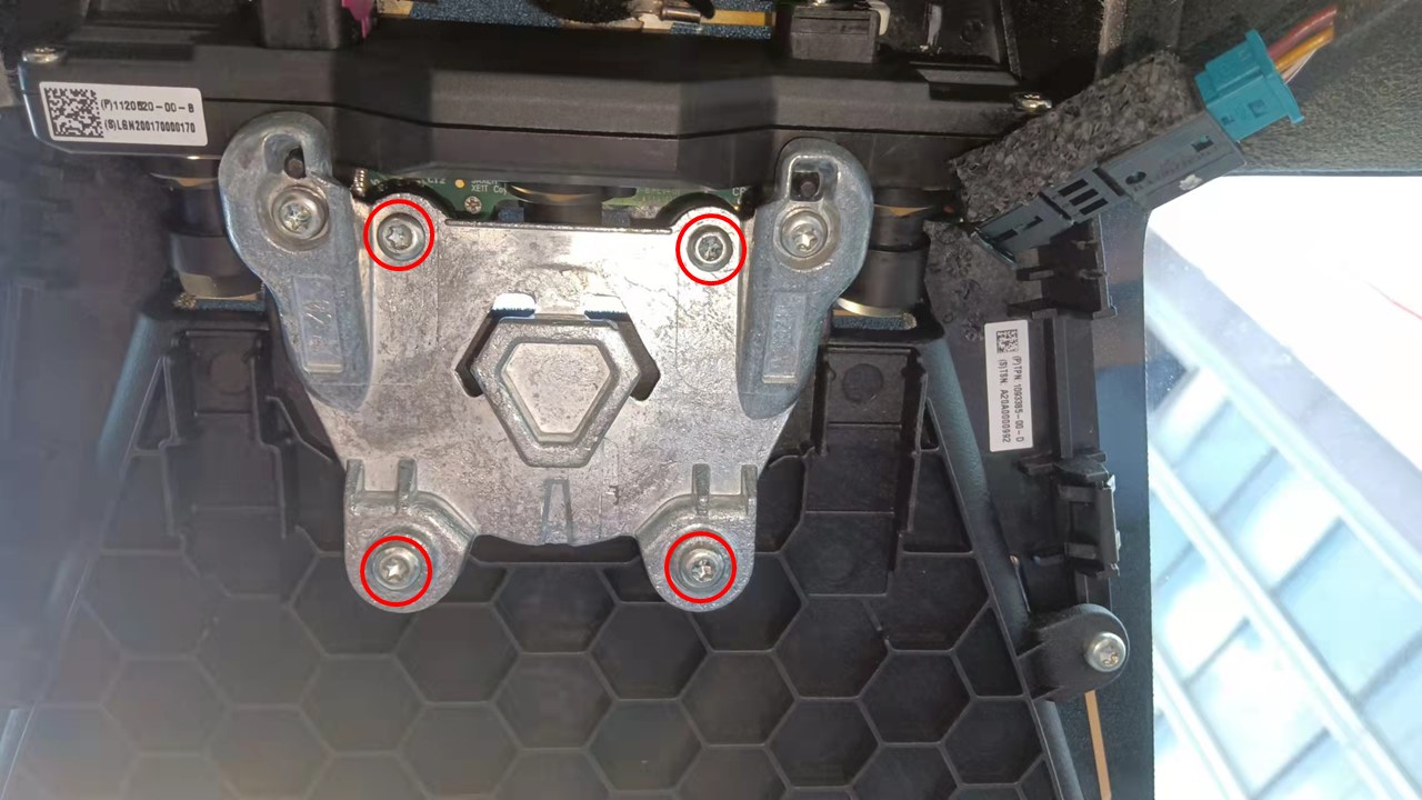 8. Remove the bolts (x4) that attach the inline triple camera and bracket assembly to the windshield, and then allow the assembly to hang from the harness.