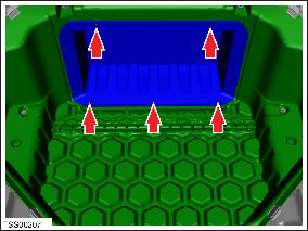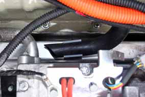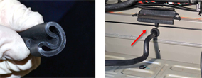 NoteFor vehicles built with the cold weather package between May 31, 2013 and July 11, 2014, a fuse box blocks access to the drain hose from the LH side. Remove the RH closeout extension assembly, then continue with the procedure by accessing the hose from the RH footwell.