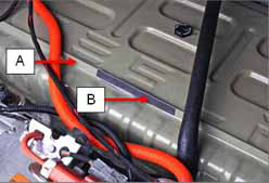 A Cover lip B Sealing tape - Clean the crossmember near the back of the A/C compressor with an alcohol wipe and allow to completely dry.
