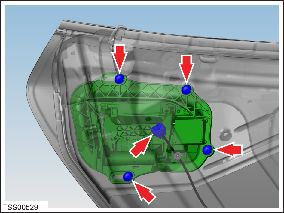 Remove the nuts that secure the assembly to the door outer panel reinforcement (torque 9 Nm).
