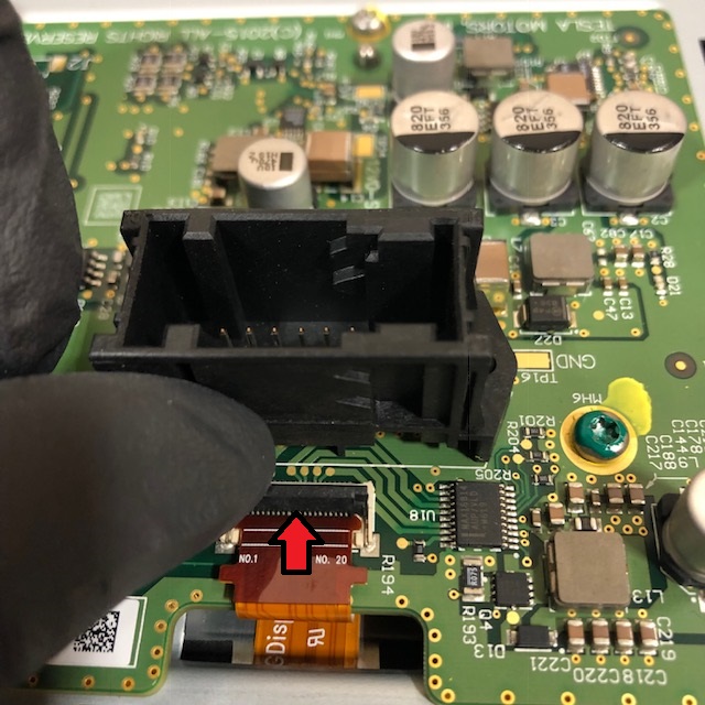 Transfer the larger ribbon cable to the new display by inserting the correct end of the ribbon cable into the connector and then closing the locking tabs. Make sure the ribbon cable is secured.