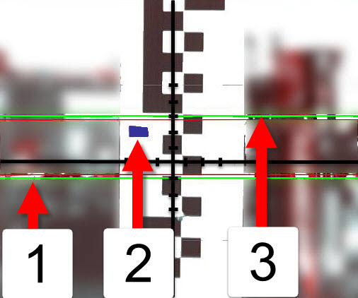 1 Positive 1 green degree line 2 Tape 3 Negative 3 green degree line - If the top edge of the tape is not between the green degree lines, retrofit a triple camera rear view mirror mount plate with integrated pitch adjustment (refer to procedure).