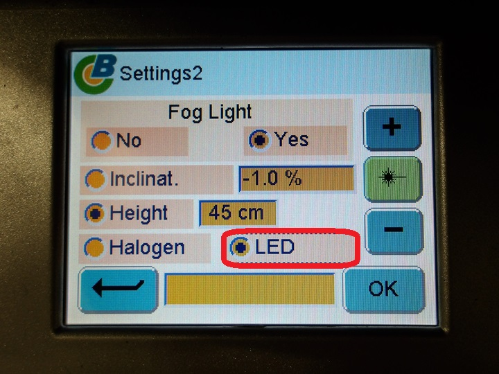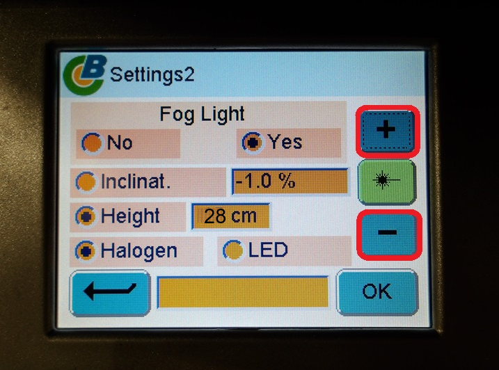 select the LH fog light icon on the headlight tester tool touchscreen, and