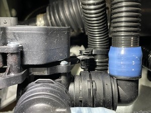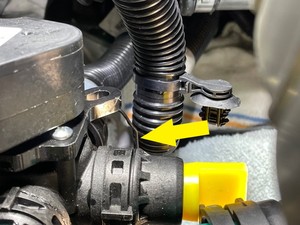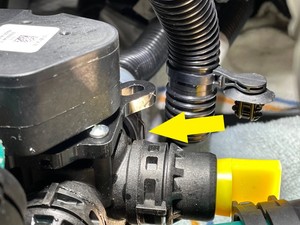 Secure coolant hose clip onto three way valve