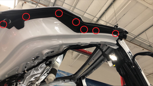 Remove the masking tape from the LH rear door front pinch sensor, position the sensor onto the door assembly, and then install the push clips (x7) that attach the sensor to the door assembly.