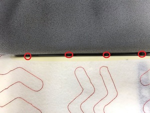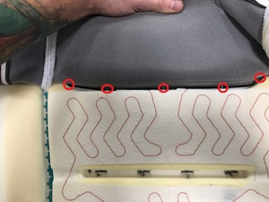 Release the hog rings (x9) that attach the LH 2nd row seat cushion and backrest bolster trim to the seat cushion, and the remove the trim from the cushion.