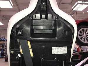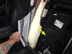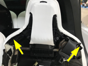 Install the clips (x4) that attach the 2nd row LH monopost under belly trim to the seat.
