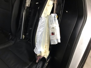 Release the studs (x2) that attach the side air bag to the upholstery air bag pouch, carefully remove the side air bag from the upholstery pouch, and then place the air bag off to the side of the seat assembly.
