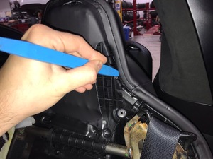 CAUTIONLimit the use of the 90 pick only to release the J-clip, as the upholstery could be damaged by poking a hole through it.NoteStarting at the outer LH rear corner, release the upper cushion upholstery away from the bottom of the seat frame.TIpUse of the following tool(s) is recommended: